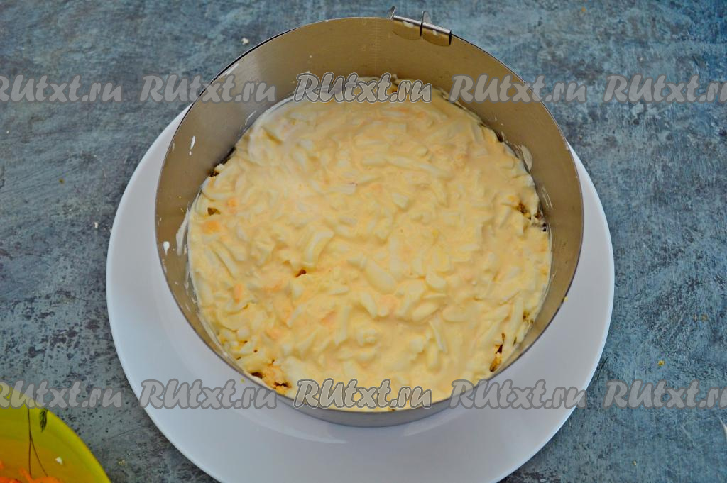 Очистить варёную морковь, натереть её на крупной тёрке, равномерно выложить следующим слоем салата, слегка утрамбовать.
