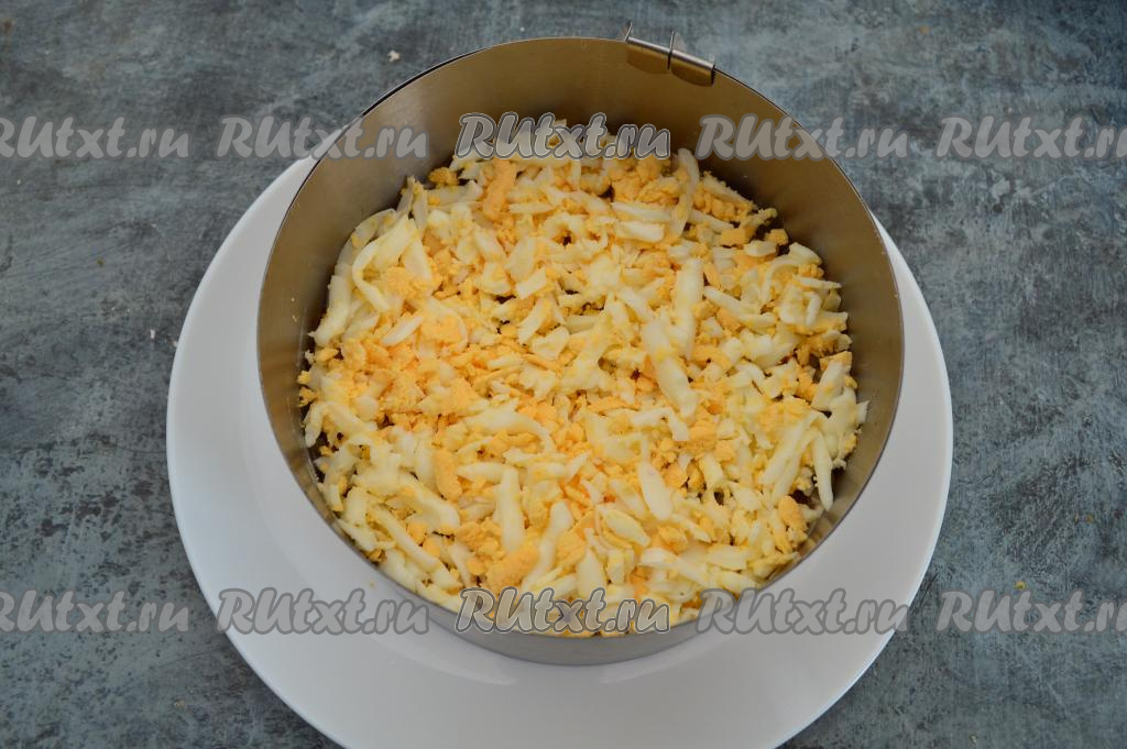 Яйца очистить, натереть на крупной тёрке и выложить следующим слоем салата, слегка подсолить, немного утрамбовать этот слой.