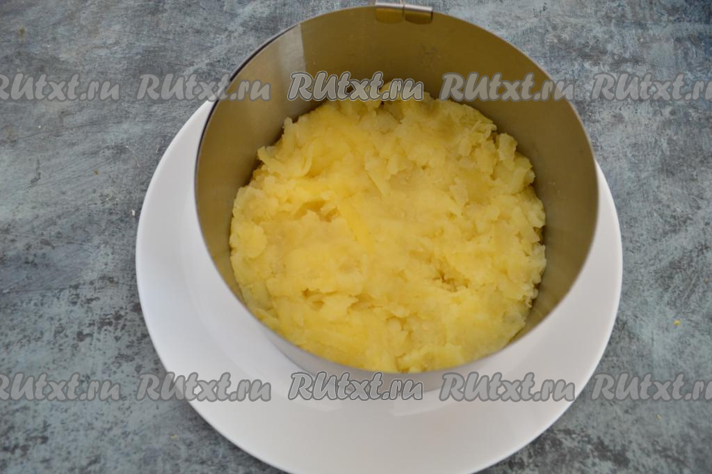 Формировать салат "Иваси под шубой" будем слоями, используя кулинарное кольцо. Кольцо установить на плоскую тарелку. Картошку очистить, натереть на крупной тёрке, подсолить, перемешать и выложить ровным слоем в кулинарное кольцо.