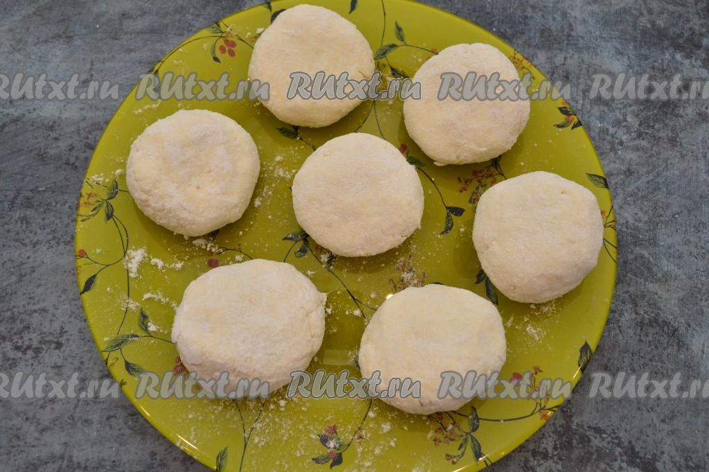 Выложить заготовки сырников на плоскую тарелку и немного прижать ладонью, чтобы придать сырникам более плоскую форму.