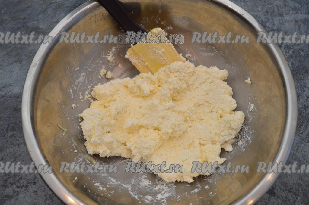 Затем начать частями добавлять муку в творожно-сырную массу. Творог бывает разной влажности, поэтому и количество муки, которое понадобится добавить, может быть разным. Главное, добавляя муку, учитывать, что творожно-сырное тесто должно получиться липким, но при этом оно должно держать форму.