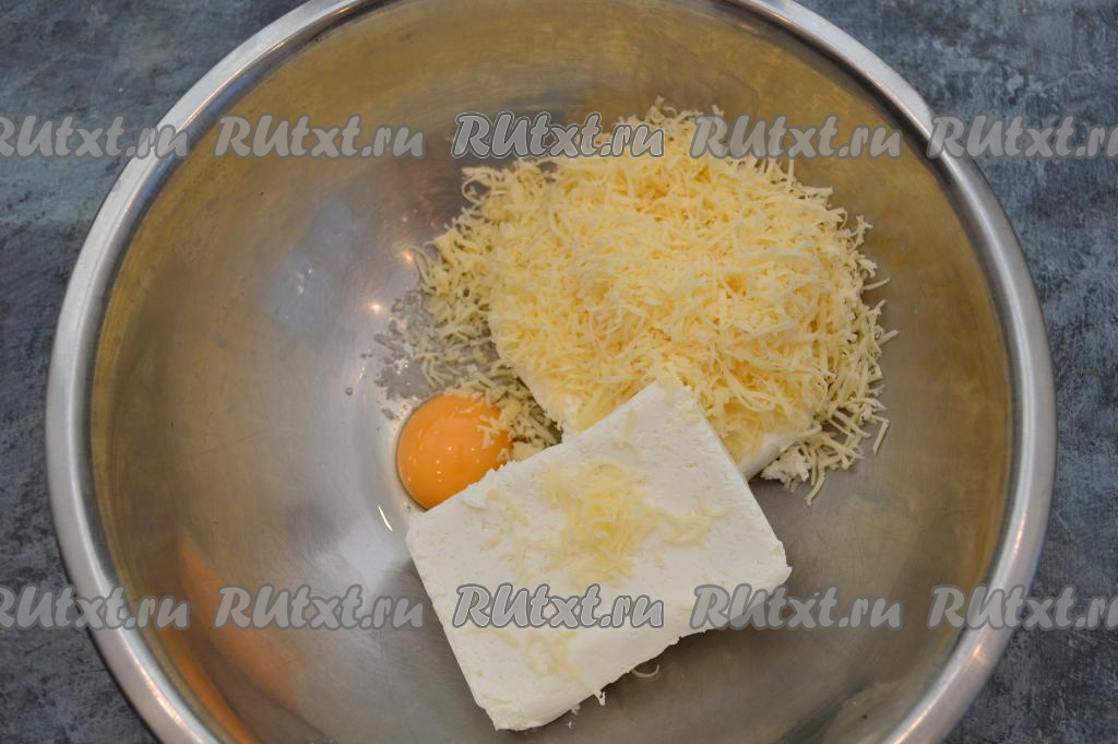 На мелкой тёрке натереть твёрдый сыр и добавить его в миску с творогом и яйцом.