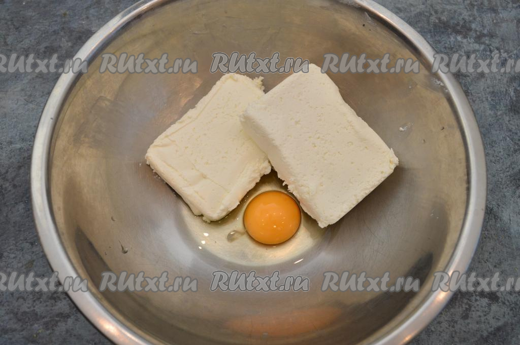 В миску выложить творог, вбить сырое яйцо, добавить щепотку соли.