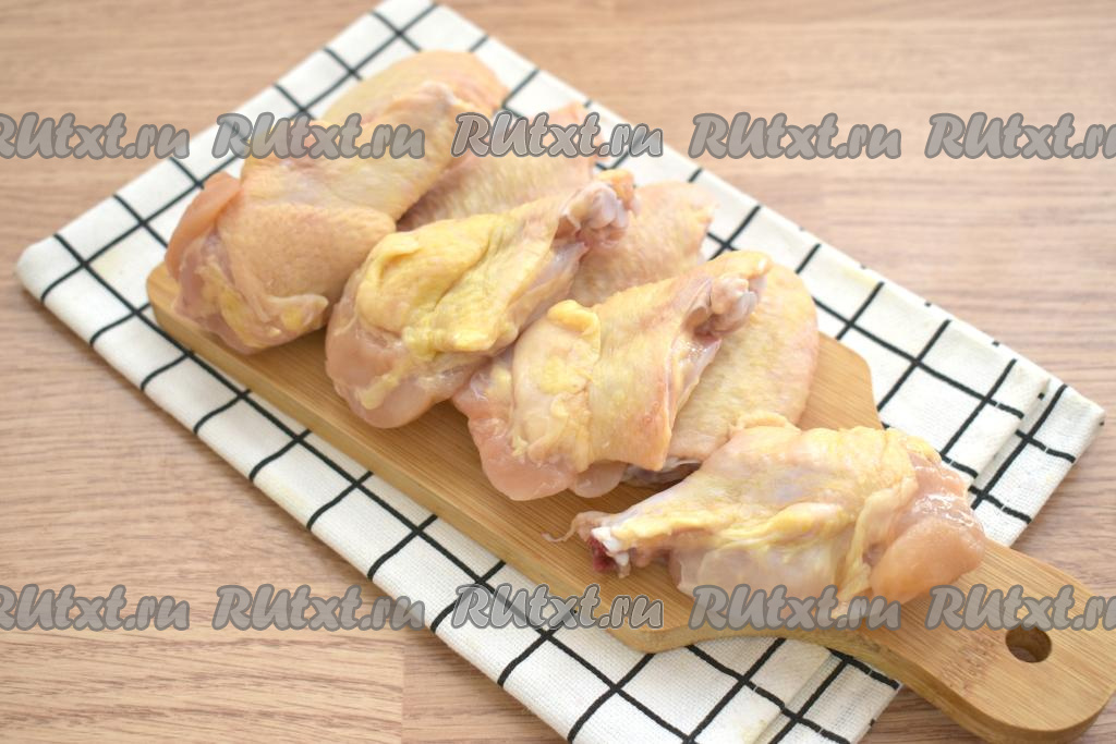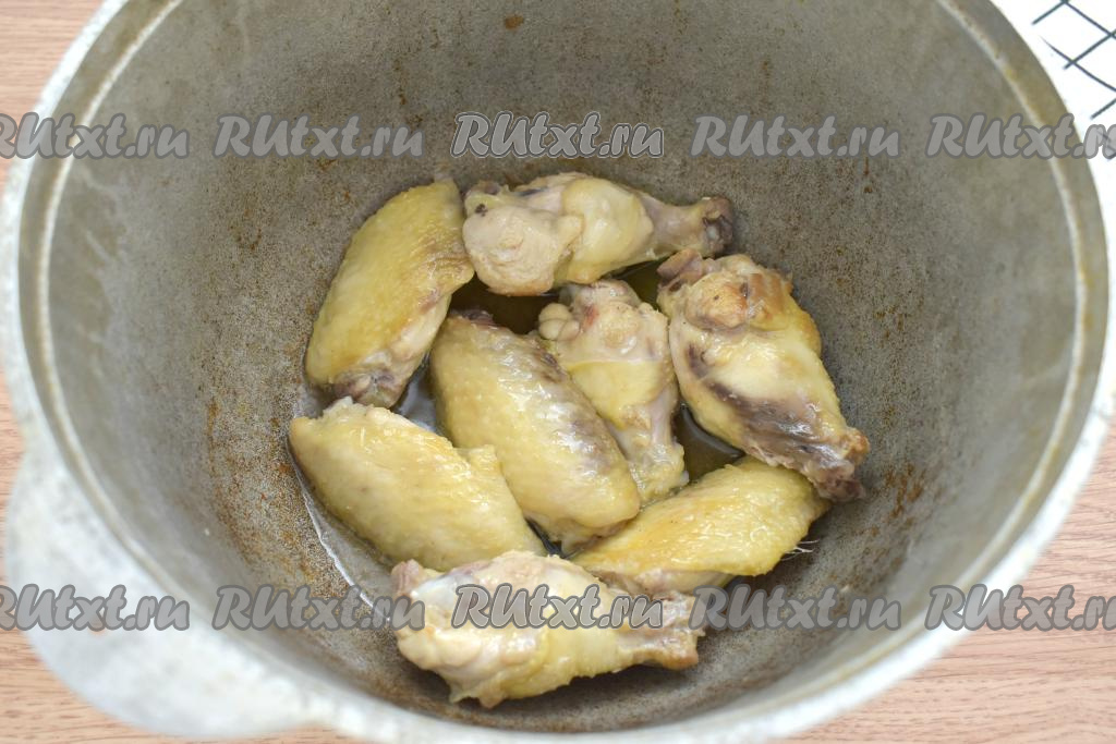 Разогреваем в казане (или в глубокой сковороде) растительное масло, затем выкладываем крылышки и обжариваем их 7-10 минут (до подрумянивания с двух сторон), периодически переворачивая, на среднем огне.