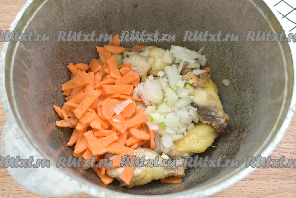 Лук нарезаем достаточно мелко, морковь - на достаточно тонкие брусочки, выкладываем к обжаренным крылышкам, перемешиваем, обжариваем 5 минут, иногда перемешивая.