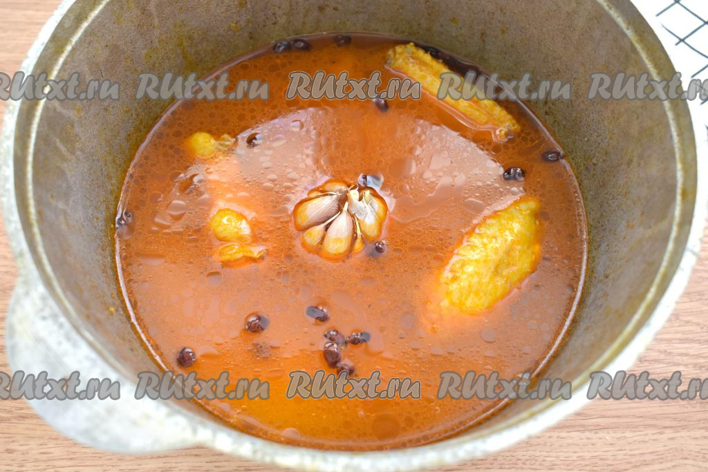 По вкусу солим, вливаем 2 стакана тёплой воды. Головку чеснока тщательно моем, убирая только грязную шелуху. Очищать чеснок не нужно. В центр казана (или сковороды) с рисом и куриными крылышкам ставим целую промытую головку чеснока, накрываем крышкой, после закипания воды убавляем огонь до минимального.