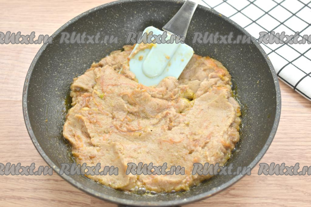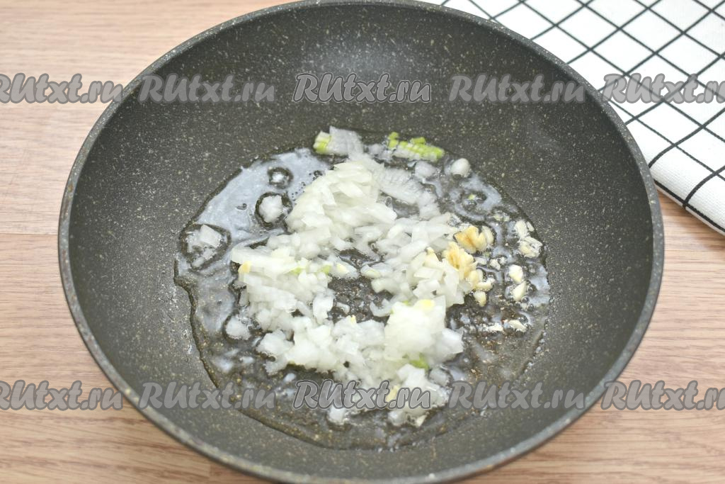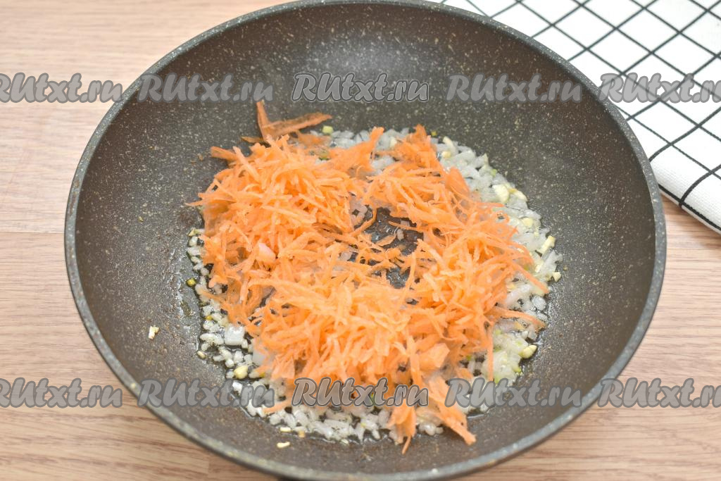 Морковь натираем на крупной тёрке, выкладываем к луку, обжаренному с чесноком, перемешиваем. Жарим овощи 3-4 минуты (до мягкости морковки), периодически перемешиваем.