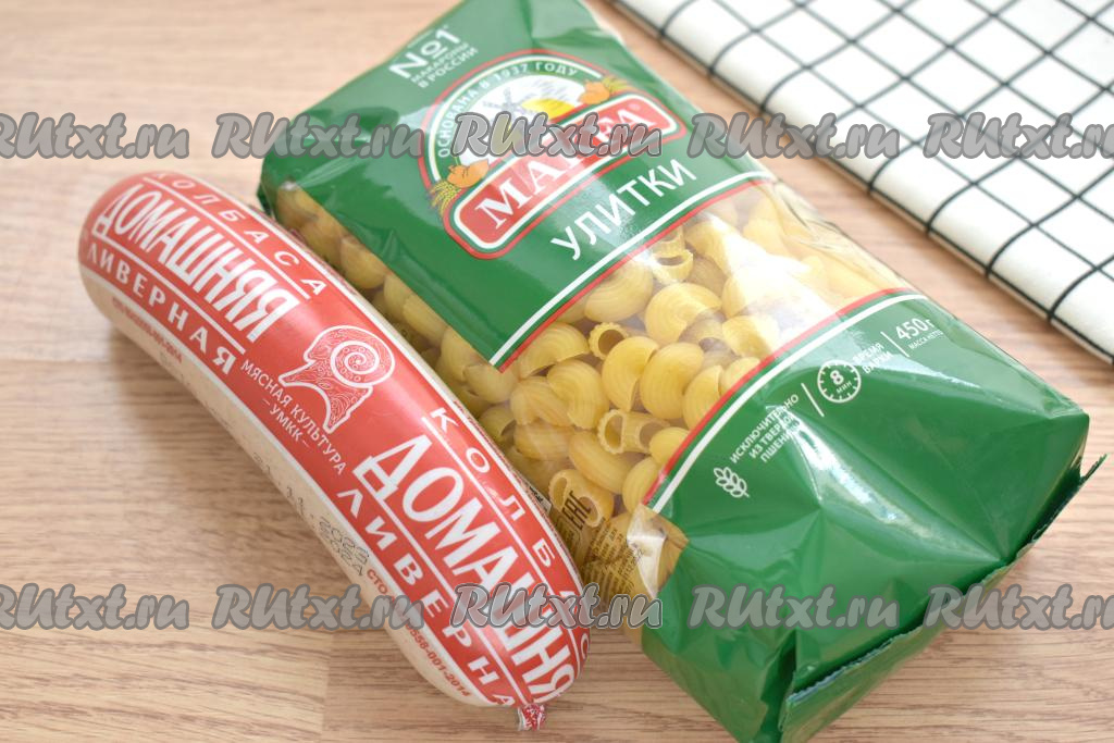 Для этого блюда я взяла макароны в форме "улиток" и вот такую покупную ливерную колбасу.