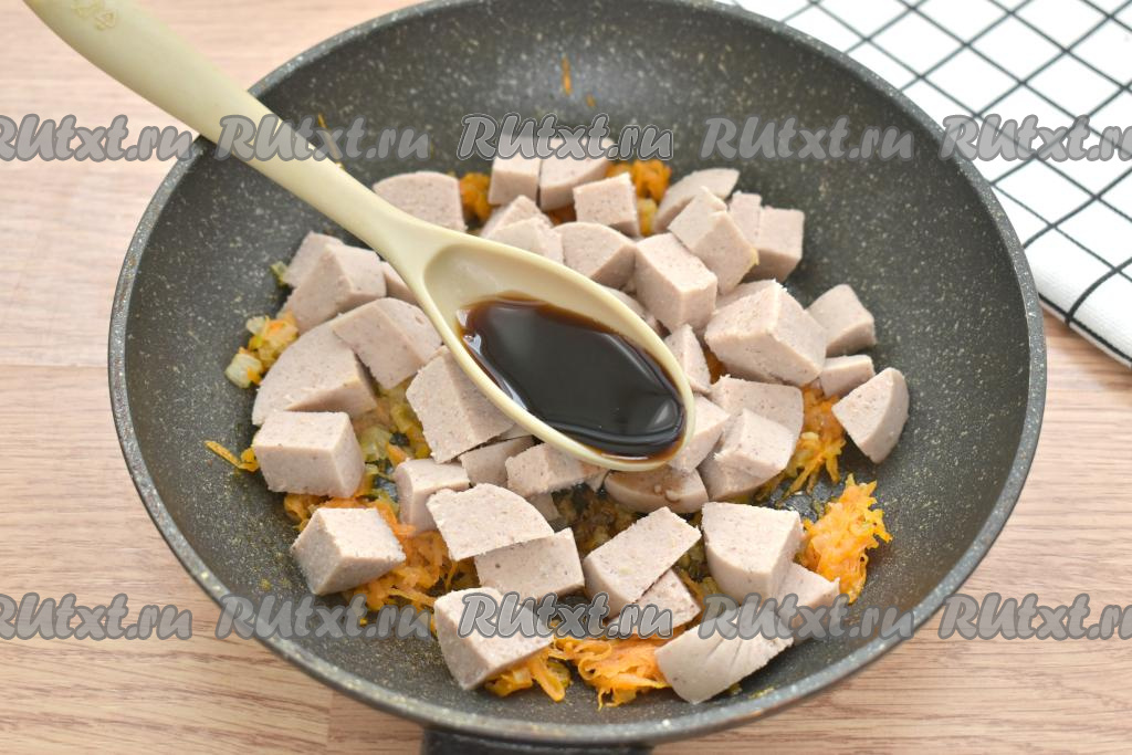 Сразу же вливаем в сковороду соевый соус, перемешиваем.
