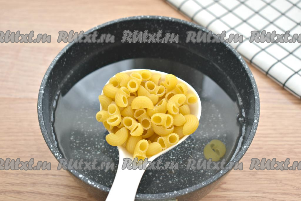 В кастрюлю наливаем 2 литра воды, по вкусу солим, ставим на огонь. В закипевшую воду кладём макароны и сразу перемешиваем. После закипания варим макароны на небольшом огне примерно 9 минут (точное время варки лучше посмотреть на упаковке макарон, которые вы отвариваете).