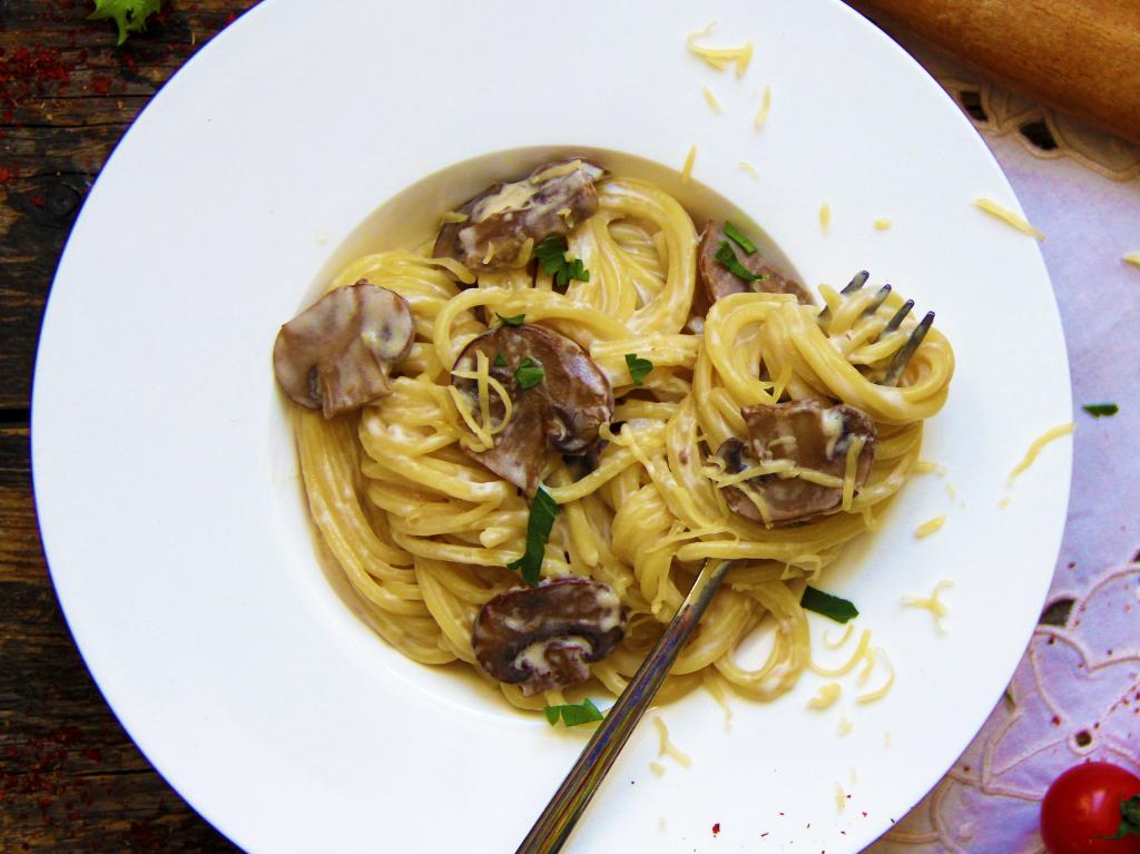 Предлагаю приготовить спагетти с шампиньонами в сливочном соусе. Блюдо получается очень вкусным и нежным, сытным и ароматным. Сливочный соус хорошо сочетается с грибами, а спагетти выступают в качестве отличного гарнира. Подавать это блюдо к столу нужно горячим.
