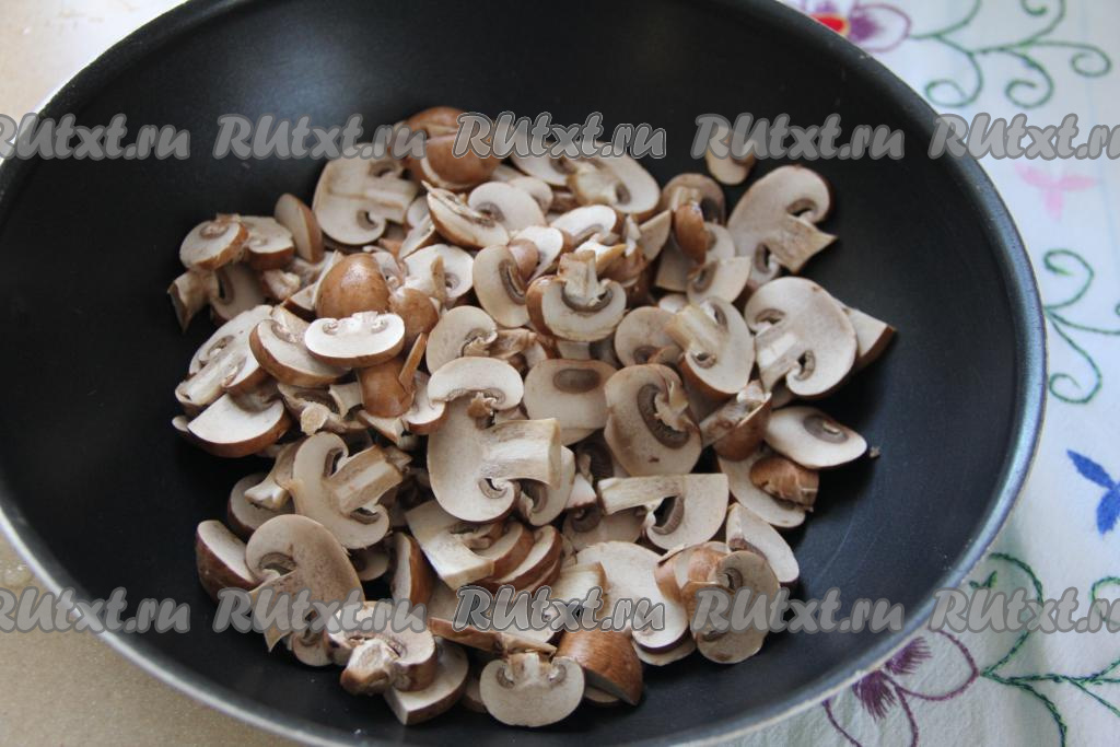 В сковороде разогреть растительное масло, затем выложить шампиньоны, нарезанные на пластинки, обжаривать грибы, периодически помешивая, в течение минут 15 на среднем огне.