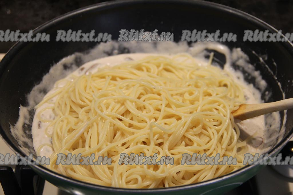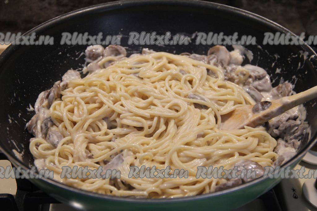 Спагетти перемешать со сливочно-грибным соусом, прогреть 2-3 минуты, периодически помешивая, и снять с огня.