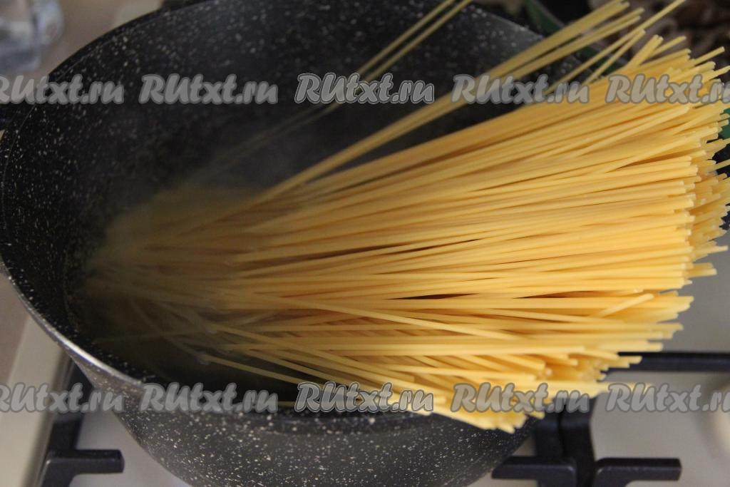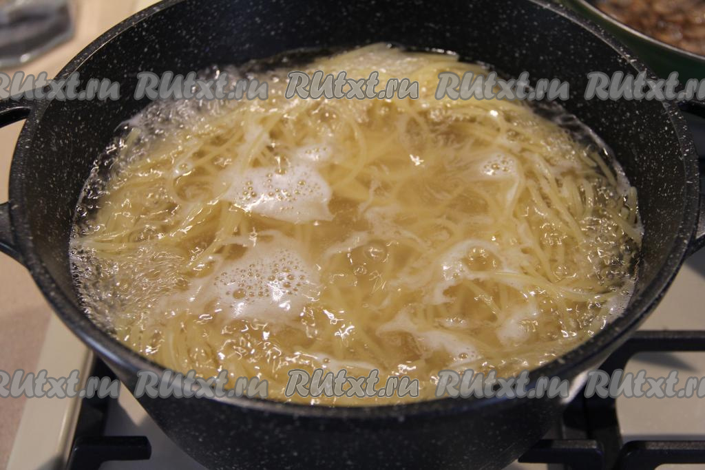Пока шампиньоны обжариваются в сковороде, вскипятить в кастрюле воду, подсолить и выложить спагетти, дать воде снова закипеть, перемешать. Варить спагетти до готовности (обычно на варку требуется минут 8-9, точное время варки смотрите на упаковке спагетти, которые вы готовите).