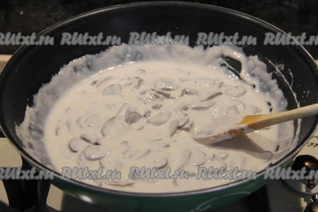 Влить сливки в сковороду, перемешать и готовить сливочный соус с шампиньонами на медленном огне минут 5, иногда помешивая.