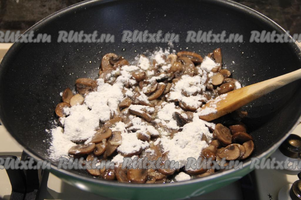 Добавить к шампиньонам муку, соль и специи, перемешать.