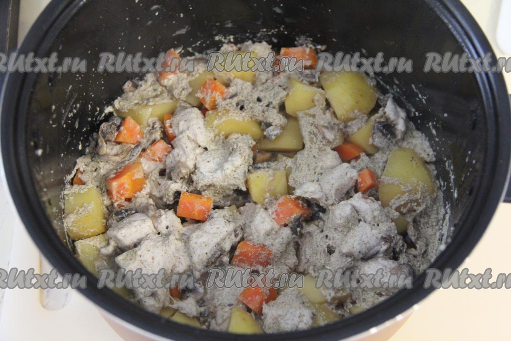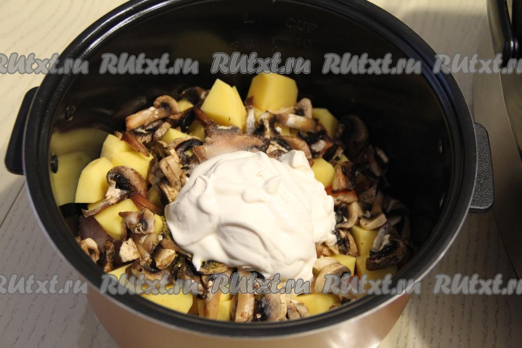 Перемешать картошку с индейкой, грибами и сметаной. Установить чашу в мультиварку и закрыть крышку. Выставить режим "Тушение" на 1 час.