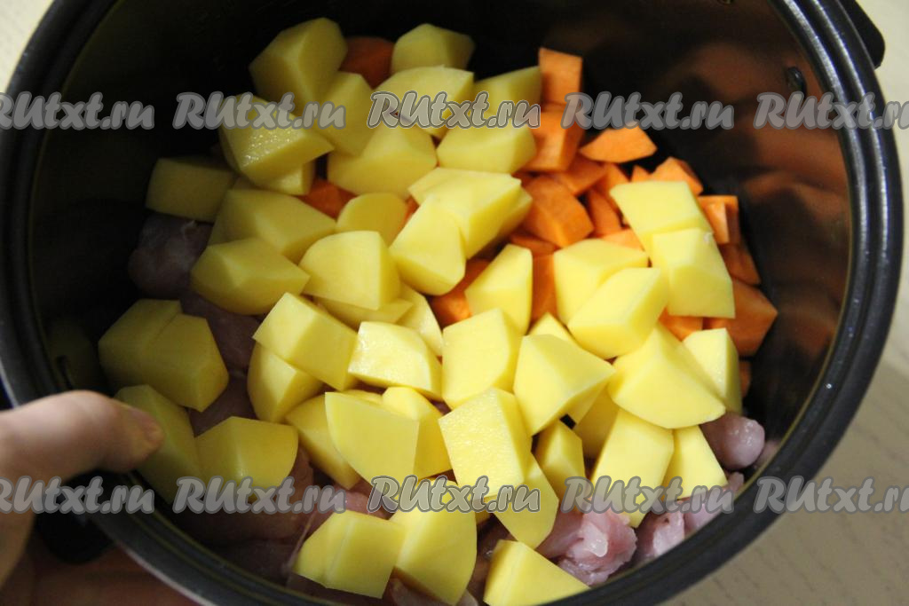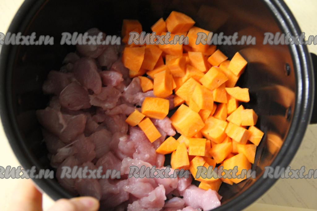 Выложить в чашу мультиварки кусочки индейки и кубики моркови.