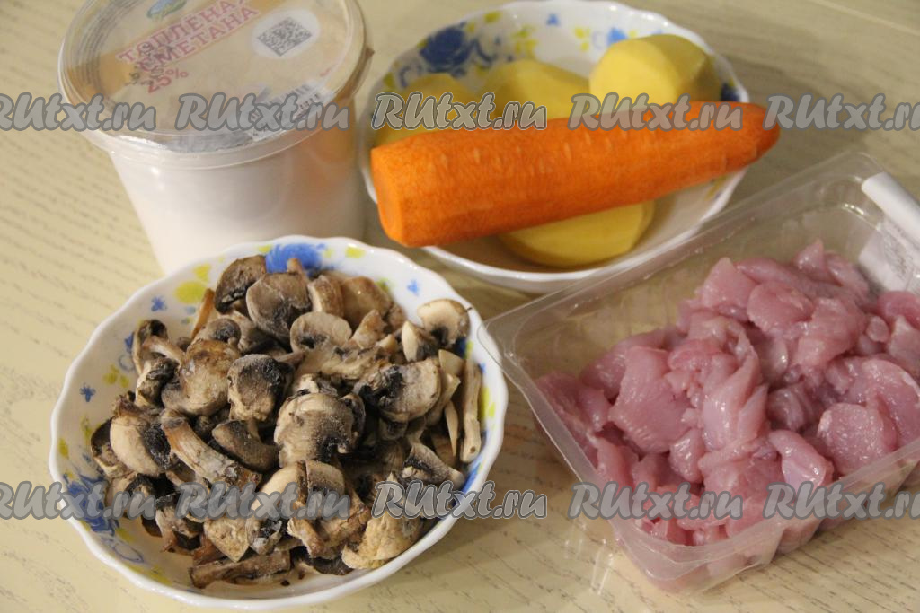 Подготовить продукты. Это блюдо можно готовить и с шампиньонами, и с предварительно отваренными в течение 25-30 минут лесными грибами. Я готовила с шампиньонами. Свежие шампиньоны нужно будет промыть водой и нарезать на пластины. У меня были замороженные шампиньоны, их можно заранее не размораживать. Если будете готовить с отваренными лесными грибами, тогда крупные грибочки нарежьте на части. Филе индейки вымыть, обсушить, нарезать на средние кусочки. Морковь и картошку очистить.