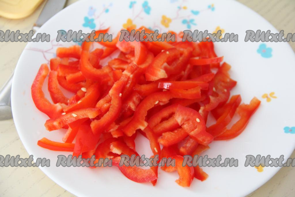 Очистить болгарский перец от семян, промыть его водой и нарезать на длинные полоски.