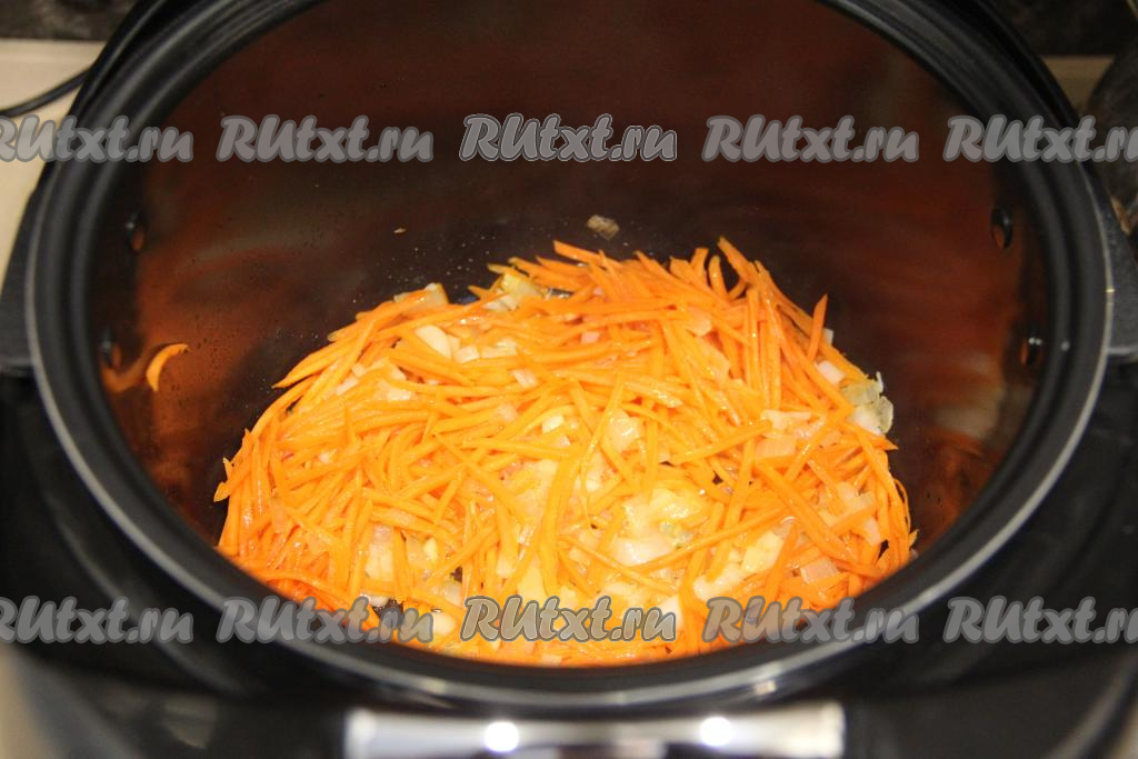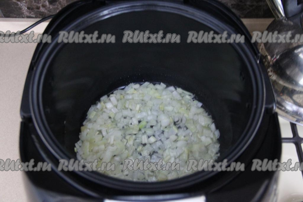 В съёмную чашу мультиварки влить растительное масло, уставить режим "Жарка". Выложить в чашу лук и чеснок, обжаривать их минут 5, иногда перемешивая.