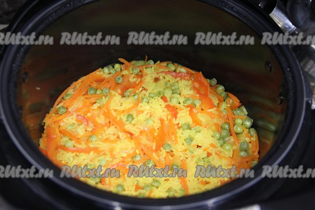 Добавить болгарский перец, перемешать и обжаривать 2-3 минуты (морковка должна стать мягкой). Затем всыпать подготовленный рис и зелёный горошек (замороженный горошек можно предварительно не размораживать), добавить соль и куркуму.