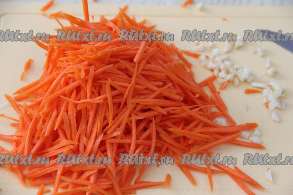 Морковь нарезать на тонкие брусочки (или натереть на крупной тёрке). Чеснок нарезать мелко.