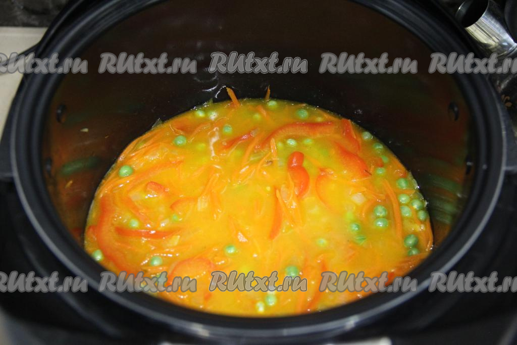 Влить в чашу мультиварки 400 миллилитров воды комнатной температуры, перемешать. Выставить режим "Плов" на 35 минут, крышку мультиварки закрыть.
