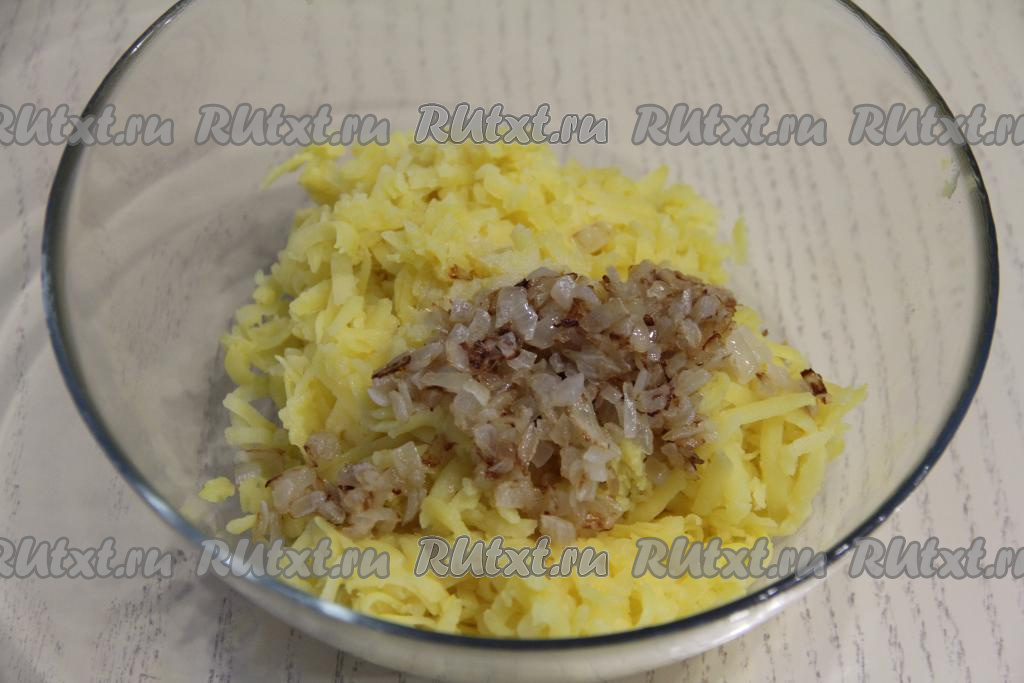 Картошку натереть в миску на крупной тёрке, добавить жареный лук, посолить.