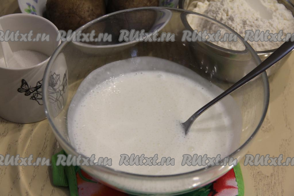 Для замешивания теста для чуду нужно в объёмную миску влить кефир, добавить соду, перемешать и оставить 4-5 минут.