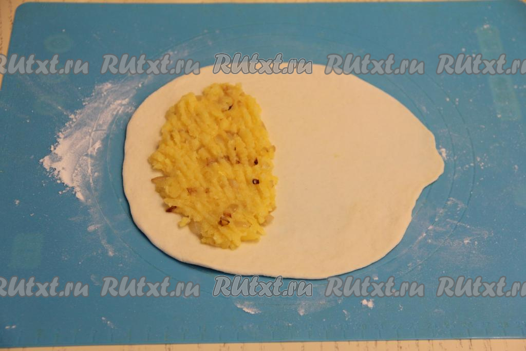 Разделить картофельную начинку на 6 частей. На одну половину раскатанного теста, отступив от краёв, выложить одну часть начинки.