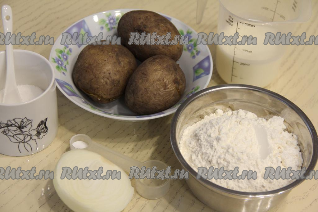Подготовить продукты. Картошку для начинки заранее сварить в кожуре до готовности (в течение минут 25 с момента закипания воды), затем полностью её остудить. Лук почистить.