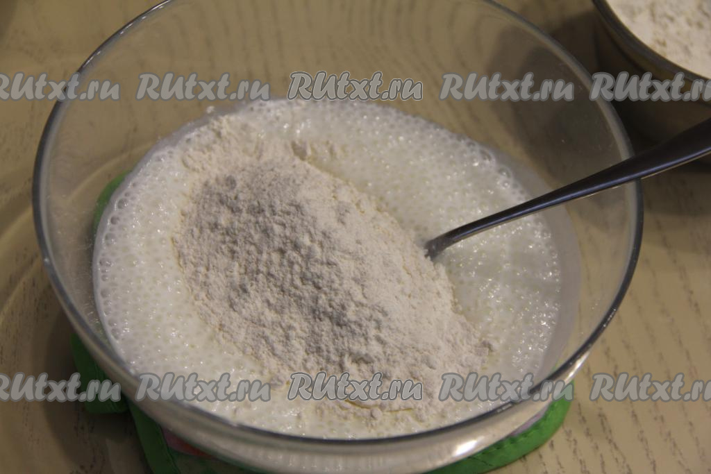 По прошествии 4-5 минут смесь кефира и соды увеличится в объёме и покроется пузырьками. В смесь кефира и соды добавить соль, всыпать 300 грамм муки.