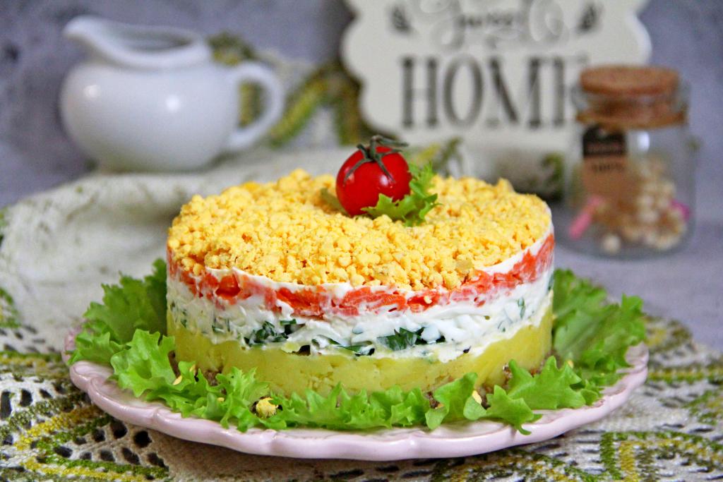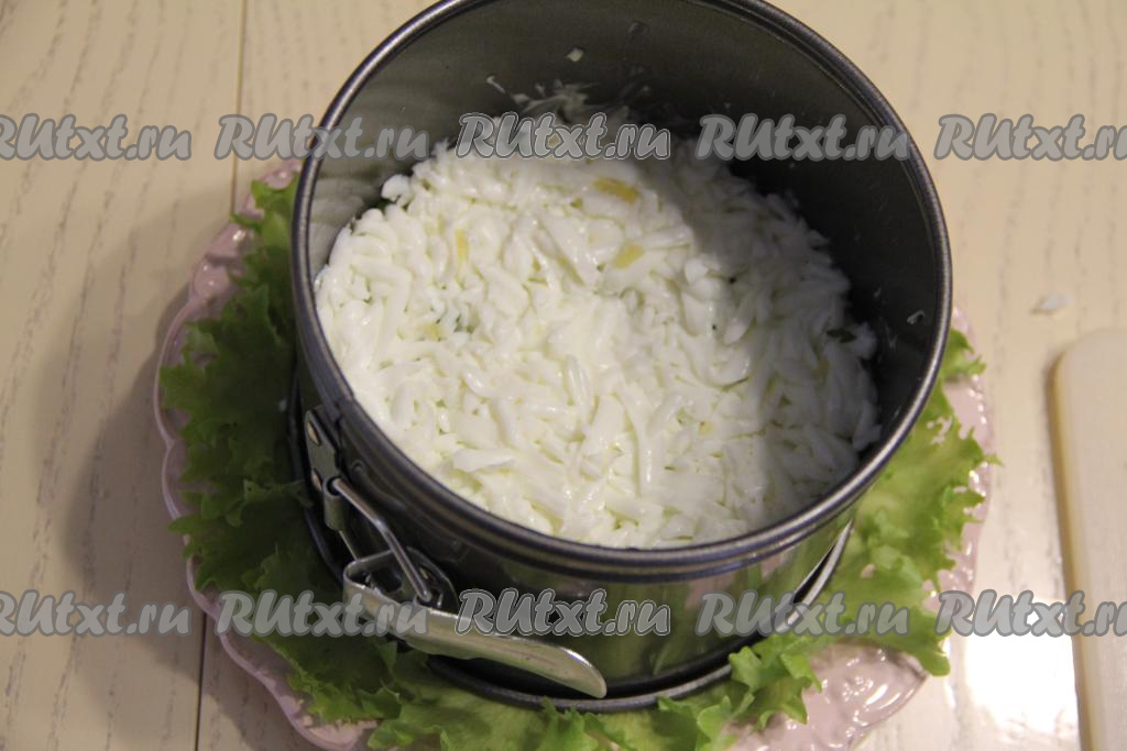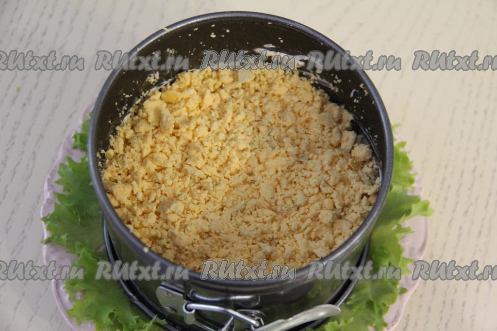 Яичные желтки раскрошить и выложить завершающим слоем салата. Поставить салат, не снимая кольцо, настояться на 2-3 часа в холодильник.