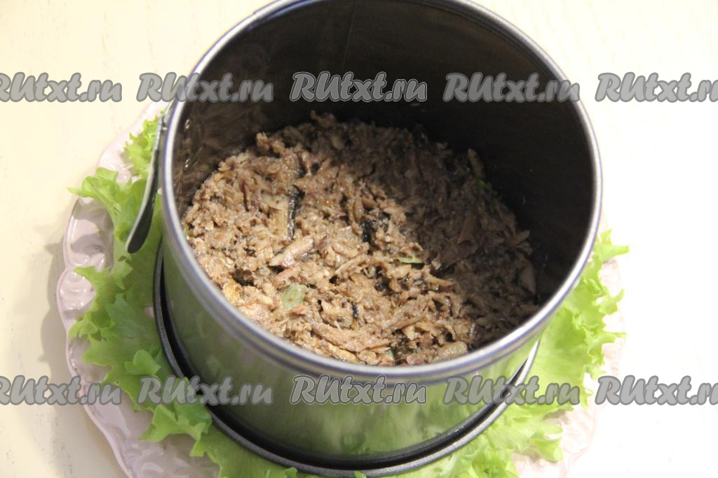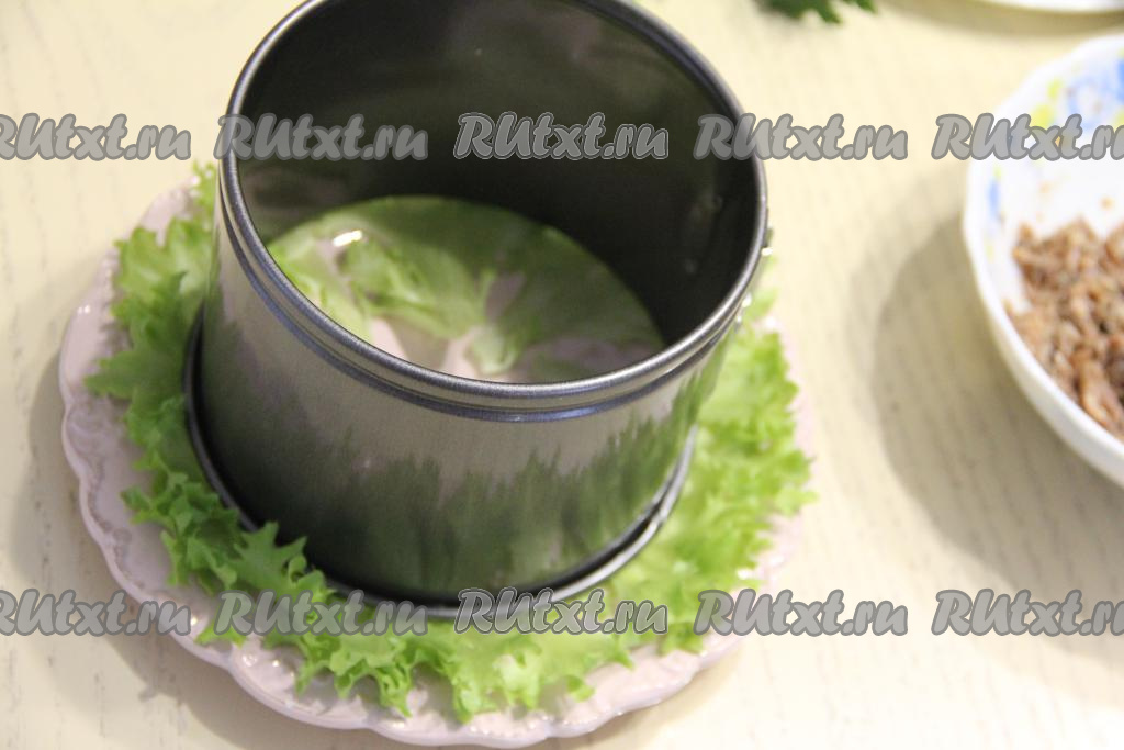 На плоскую тарелку, по желанию, выложить листья салата, затем выставить сервировочное кольцо диаметром 15 сантиметров.