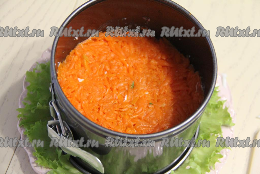 Следующим слоем будет очищенная и натёртая на крупной тёрке морковка, слегка утрамбовать слой.
