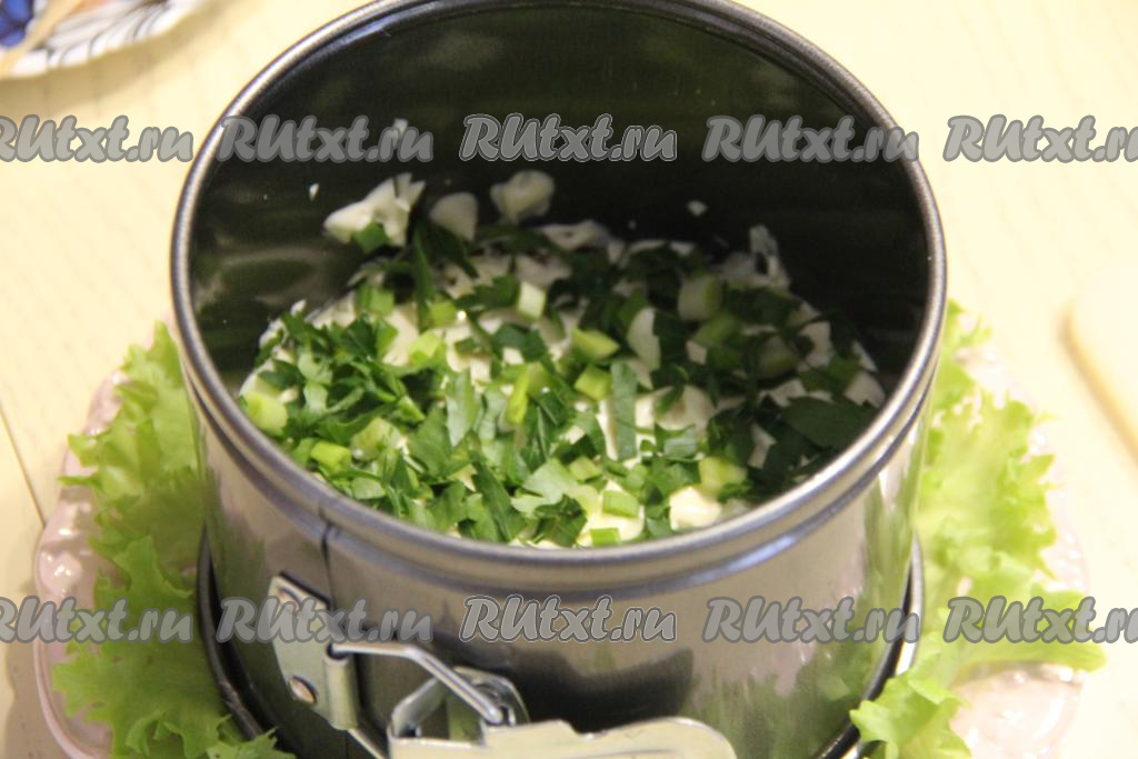 Следующим слоем разложить мелко нарезанную зелень.