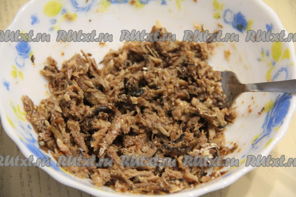 Шпроты достать из масла, переложить в миску и размять вилкой.