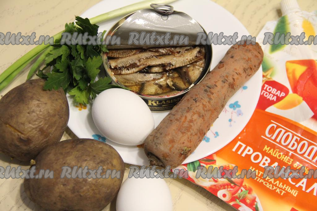Подготовить продукты. Картошку и морковь сварить в кожуре до готовности (в течение 25-30 минут с момента закипания воды, готовые овощи будут легко прокалываться ножом), затем полностью их остудить. Сварить вкрутую яйца (в течение 10 минут после начала кипения воды), остудить их и почистить. Зелень вымыть и обсушить (я взяла петрушку и зелёный лук, можно взять только зелёный лук).
