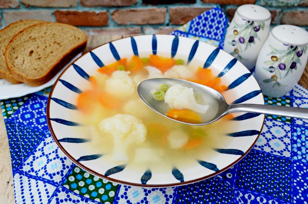 Аппетитный, насыщенный и очень вкусный суп, сваренный с цветной капустой и зелёным горошком, разлить по тарелкам и горячим подать к столу. При желании при подаче блюдо можно дополнить зеленью.