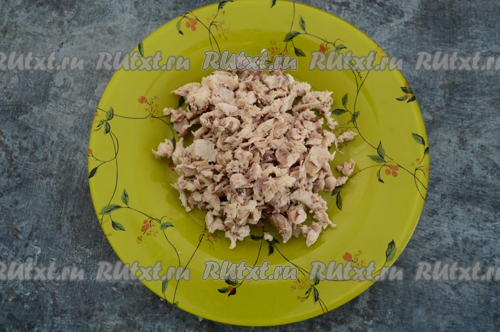 Сварившееся куриное мясо достать из бульона, дать немного остыть, отделить от костей, нарезать на части. Косточки выбросить. Бульон, если нужно, процедить. Вернуть нарезанное мясо в кастрюлю с бульоном, поставить на огонь, дать закипеть.