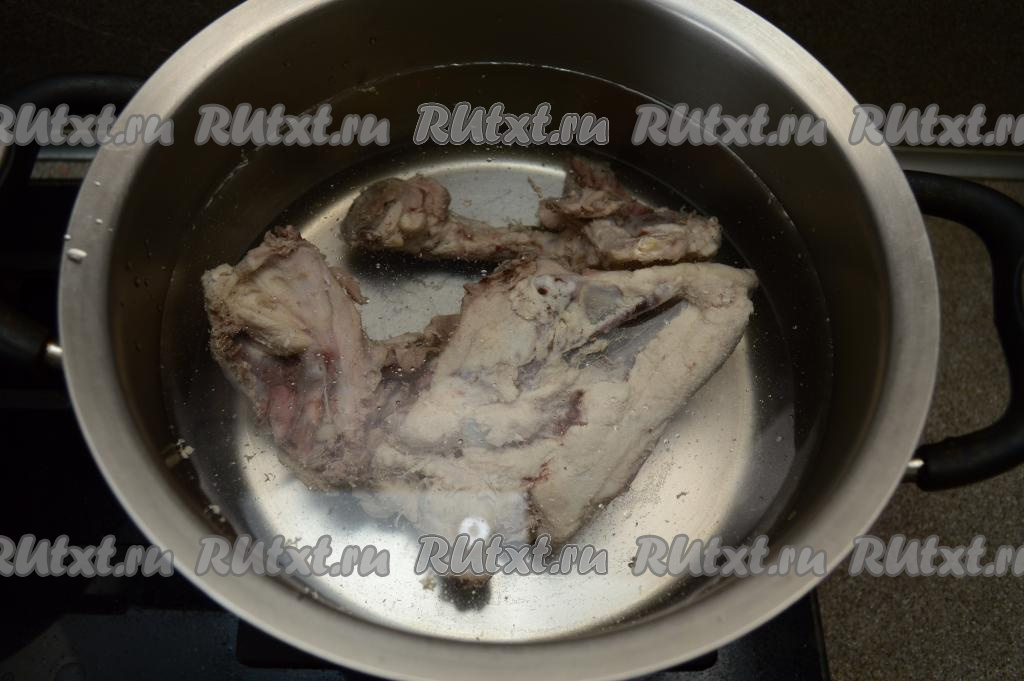 Мясо курицы на кости вымыть, выложить в кастрюлю, залить 2 литрами воды, поставить на огонь. После того как вода закипит, убрать пену с поверхности бульона и варить мясо на небольшом огне минут 25-30.