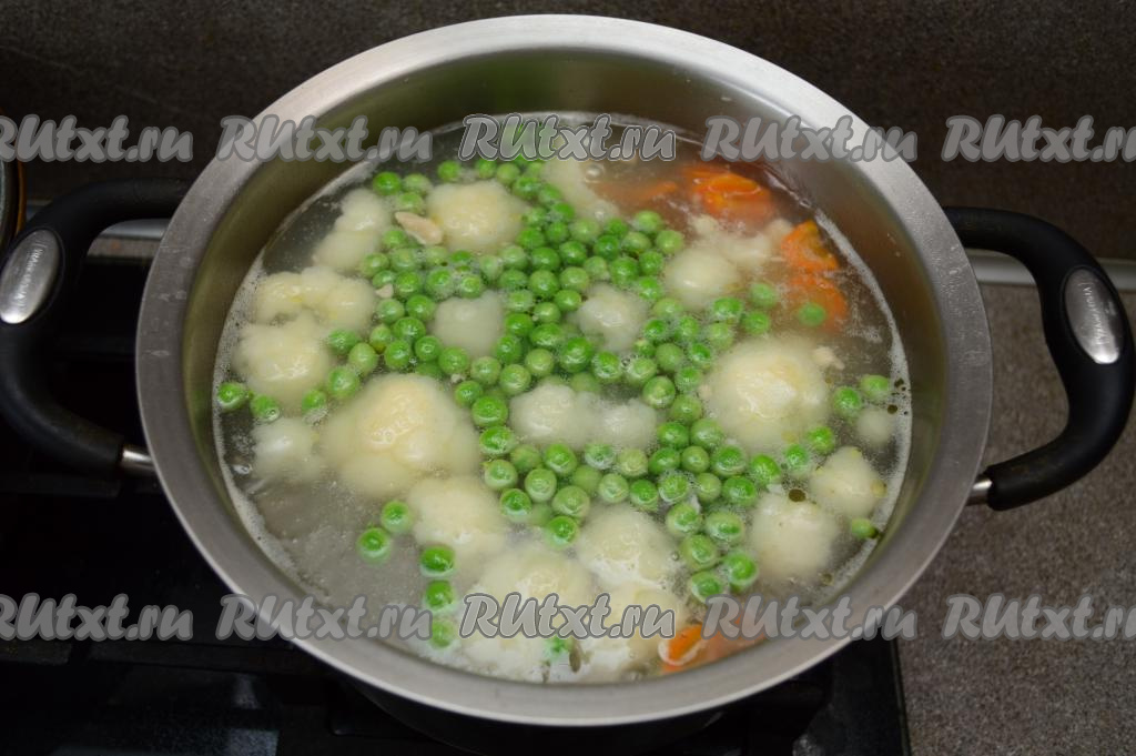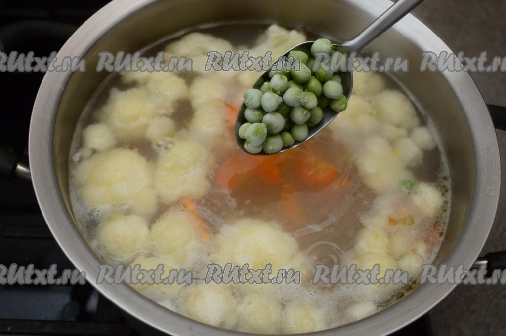 По прошествии 5 минут в суп с цветной капустой всыпать замороженный зелёный горошек, дать закипеть и варить 6 минут на небольшом огне. Если вы варите суп со свежим зелёным горошком, тогда дайте капусте провариться с момента закипания 7 минут, а затем уже всыпьте горошек, дайте закипеть и варите суп на небольшом огне минуты 3-4.