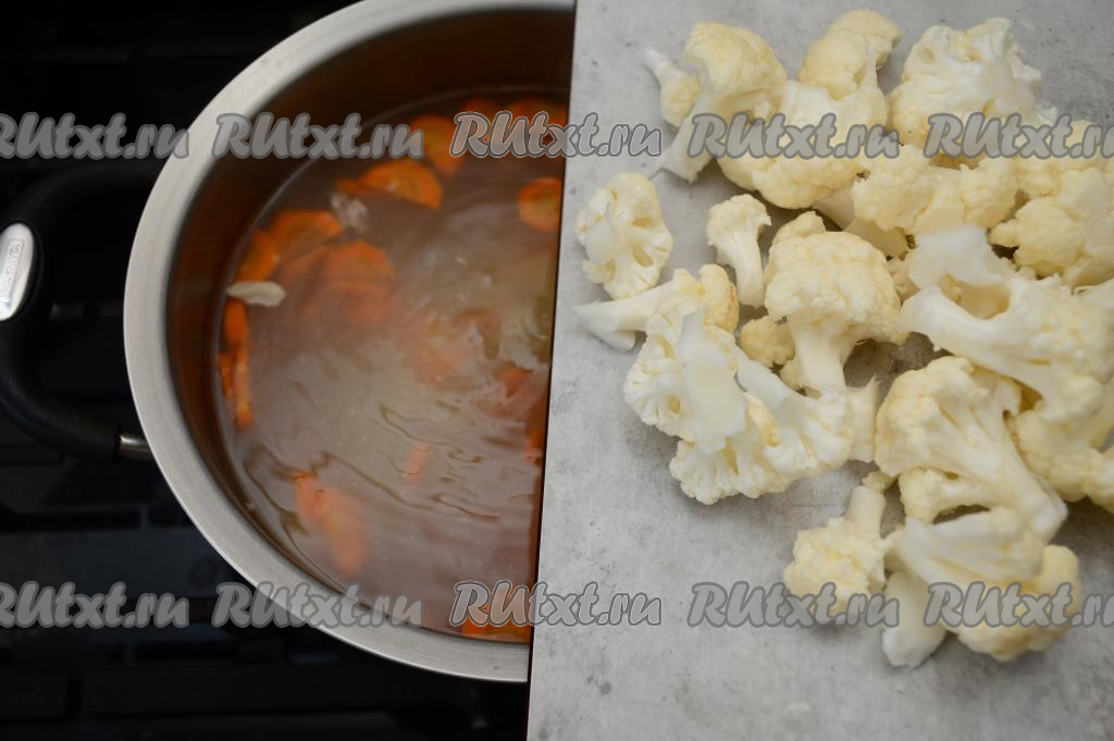 После того как бульон с куриным мясом закипит, добавить в кастрюлю нарезанные морковку и картошку, дать закипеть, и, убавив огонь до минимума, варить суп 10-12 минут. Затем добавить в суп цветную капусту, посолить, дать закипеть, варить на небольшом огне 5 минут.