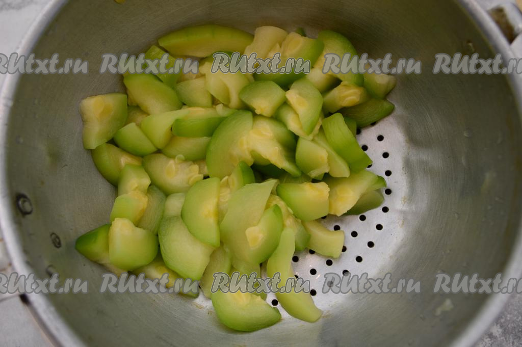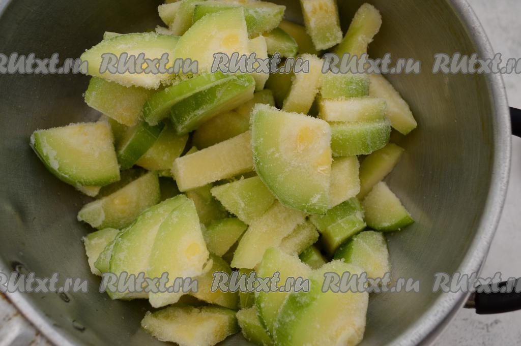 Если времени мало, тогда для того чтобы кабачки разморозились побыстрее, можно подставить дуршлаг с кабачками под тёплую воду, после того как с кабачков сойдёт наледь, выключить воду, оставить кабачки в дуршлаге до полного размораживания.
