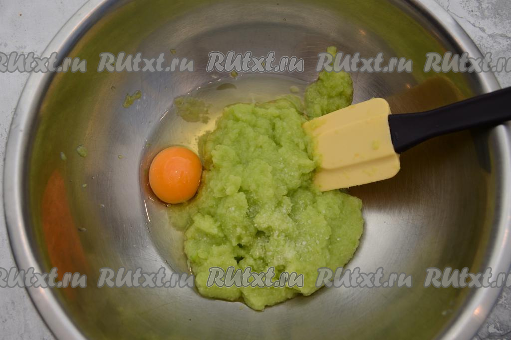 Выложить пюре из кабачков (или размороженные и отжатые от лишней жидкости натёртые кабачки) в глубокую миску, всыпать соль, вбить сырое яйцо.