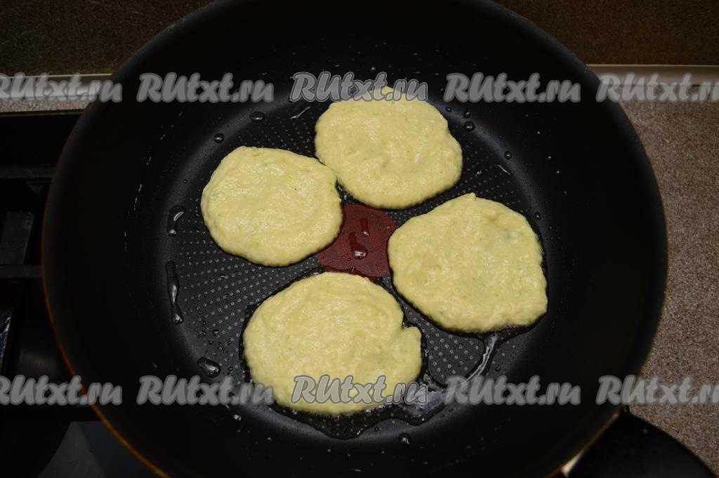 Сковороду разогреть с добавлением растительного масла, уменьшить огонь до среднего. Затем выкладывать в сковороду по 1 столовой ложке кабачкового теста, формирую небольшие округлые оладьи. Жарить оладьи из замороженных кабачков 2-3 минуты (до румяной корочки снизу).
