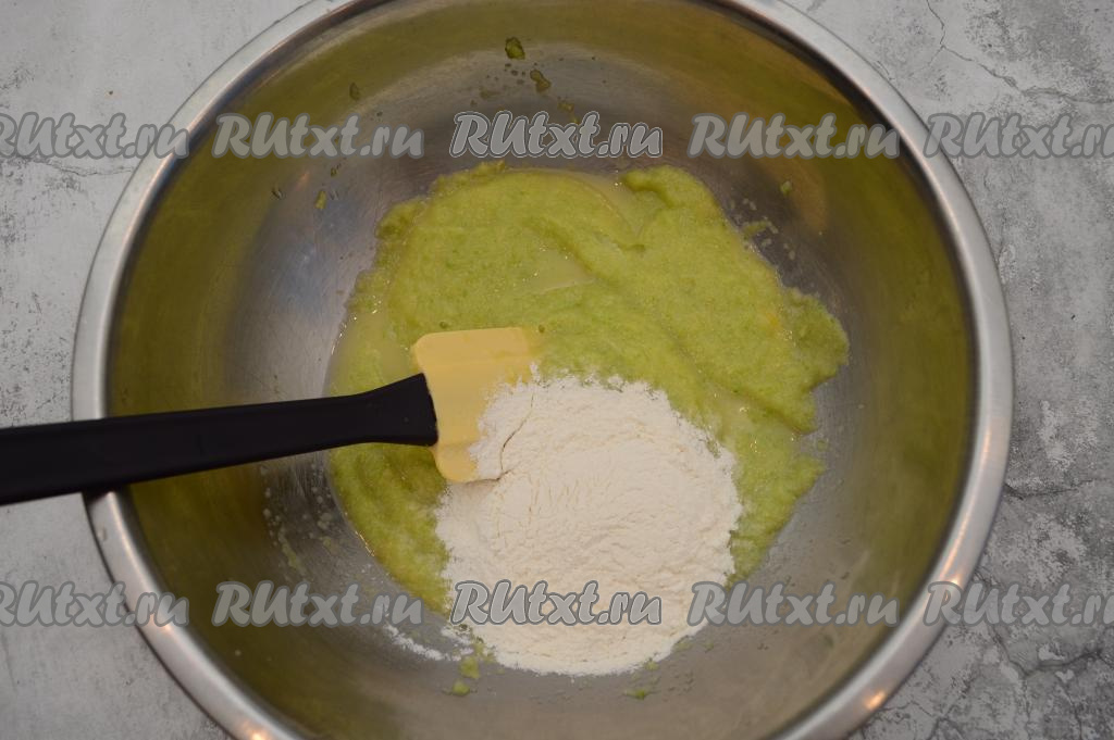 Затем постепенно, по 1 столовой ложке, добавлять муку в тесто, каждый раз полностью вмешивая её. У нас должно получить кабачковое тесто, напоминающее по консистенции сметану средней жирности.