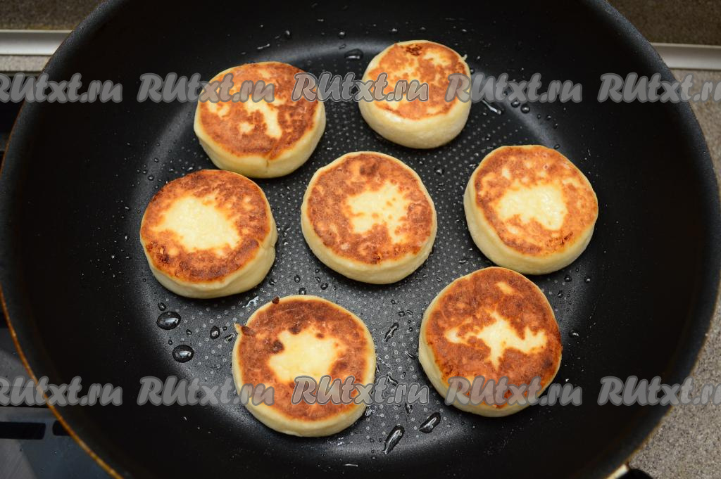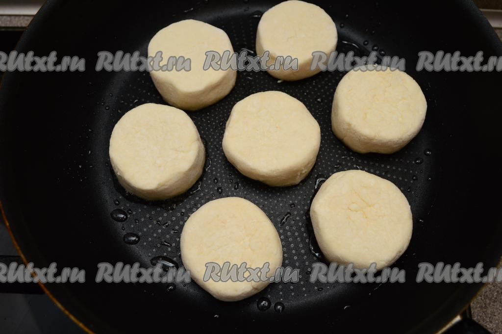Часть сырников, приготовленных по ГОСТу, я решила сразу пожарить. Для этого на сковороде нужно разогреть растительное масло, затем выложить заготовки сырников. Жарить сырники на среднем огне минуты 2-3 минуты (до румяности снизу).