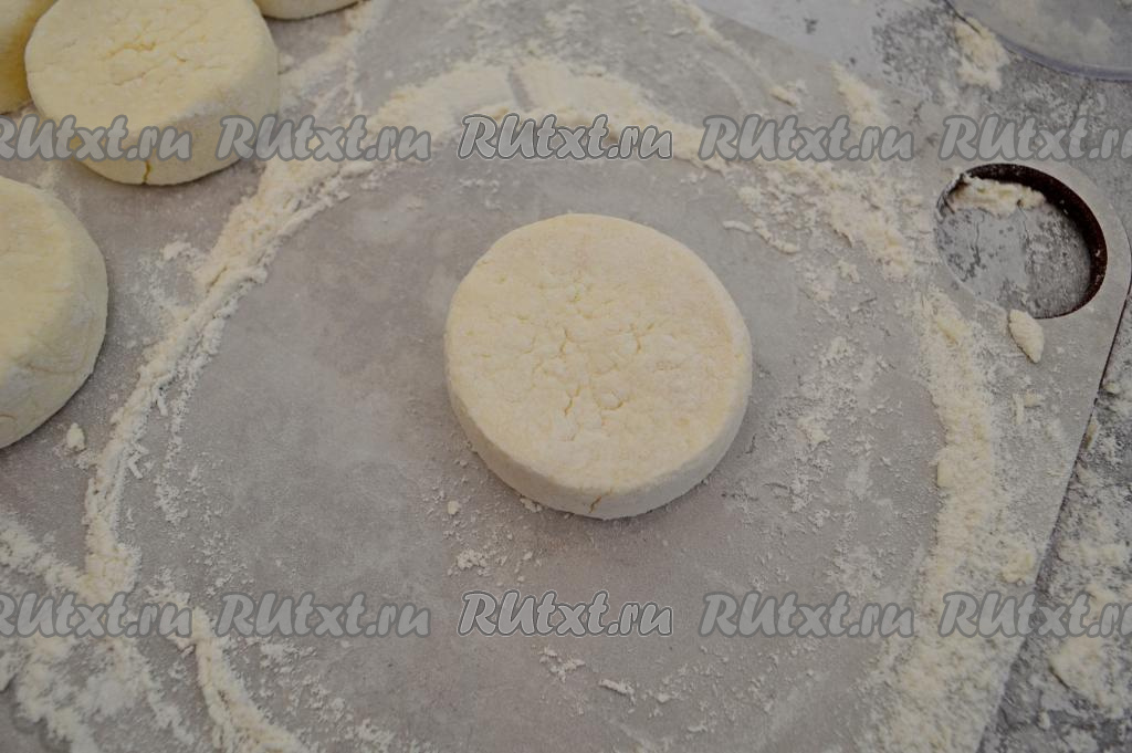 Сырник приобретёт идеальную округлую форму. Перевернуть сырник на другую сторону, немного приплюснуть рукой, накрыть стаканом, снова повращать стакан, чтобы сырник приобрёл округлую форму. Ещё раз слегка приплюснуть. У нас получится идеально круглый сырник.